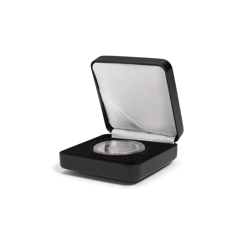 For the most elegant presentation of encapsulated coins may we recommend these high-quality coin boxes with silk-lined lid and black velvet inlay. A satin ribbon inside the lid can hold a personal message if desired. A sturdy metal frame protects the coin