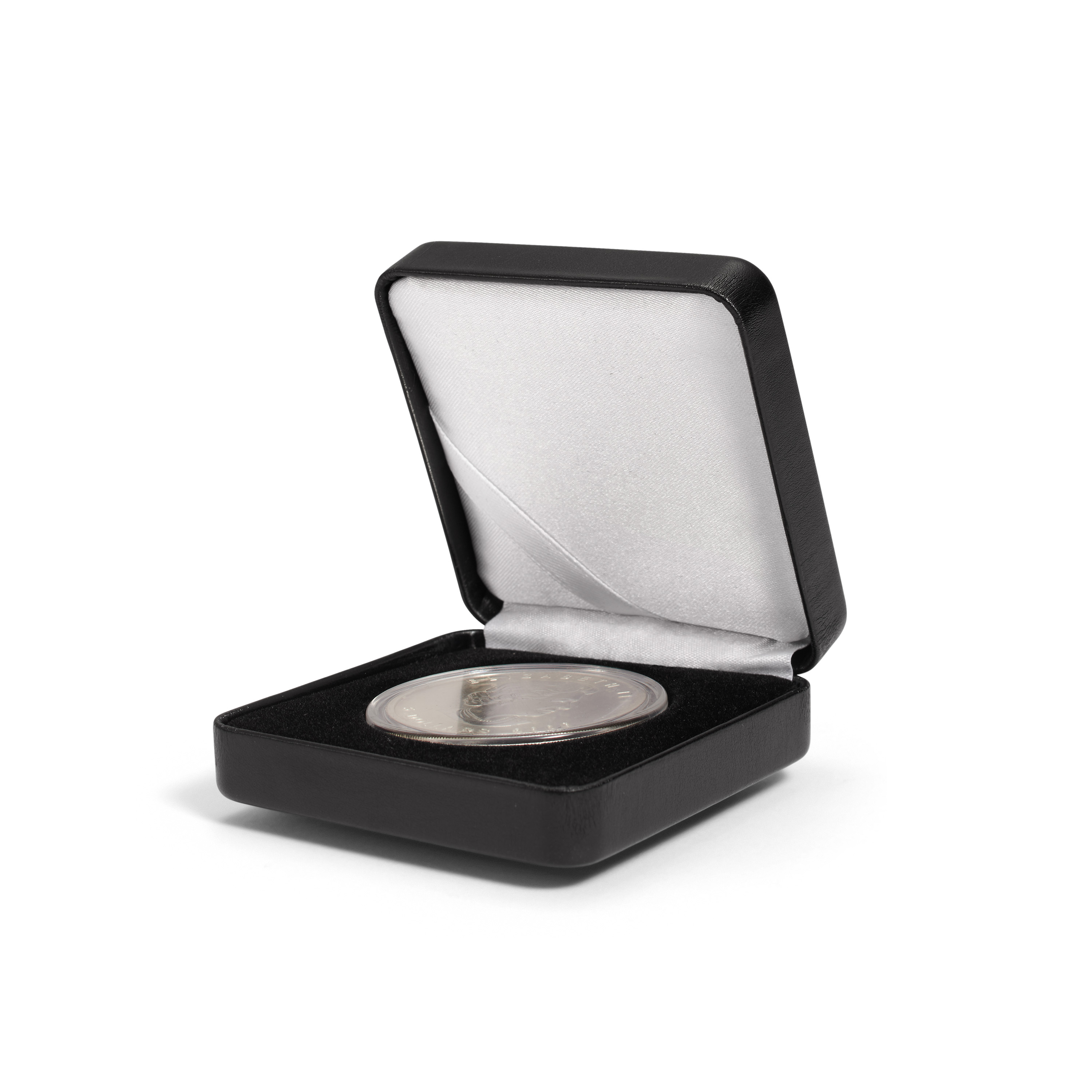 For the most elegant presentation of encapsulated coins may we recommend these high-quality coin boxes with silk-lined lid and black velvet inlay. A satin ribbon inside the lid can hold a personal message if desired. A sturdy metal frame protects the coin