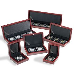Our classy VOLTERRA presentation cases in mahogany wood grain finish are now also available for storing QUADRUM/ QUADRUM XL coin capsules. Padded lid with black satin lining, and black velour insert. Solid construction, gold plated hinges, secure magnetic closure. Choose between 9 different styles to suit your