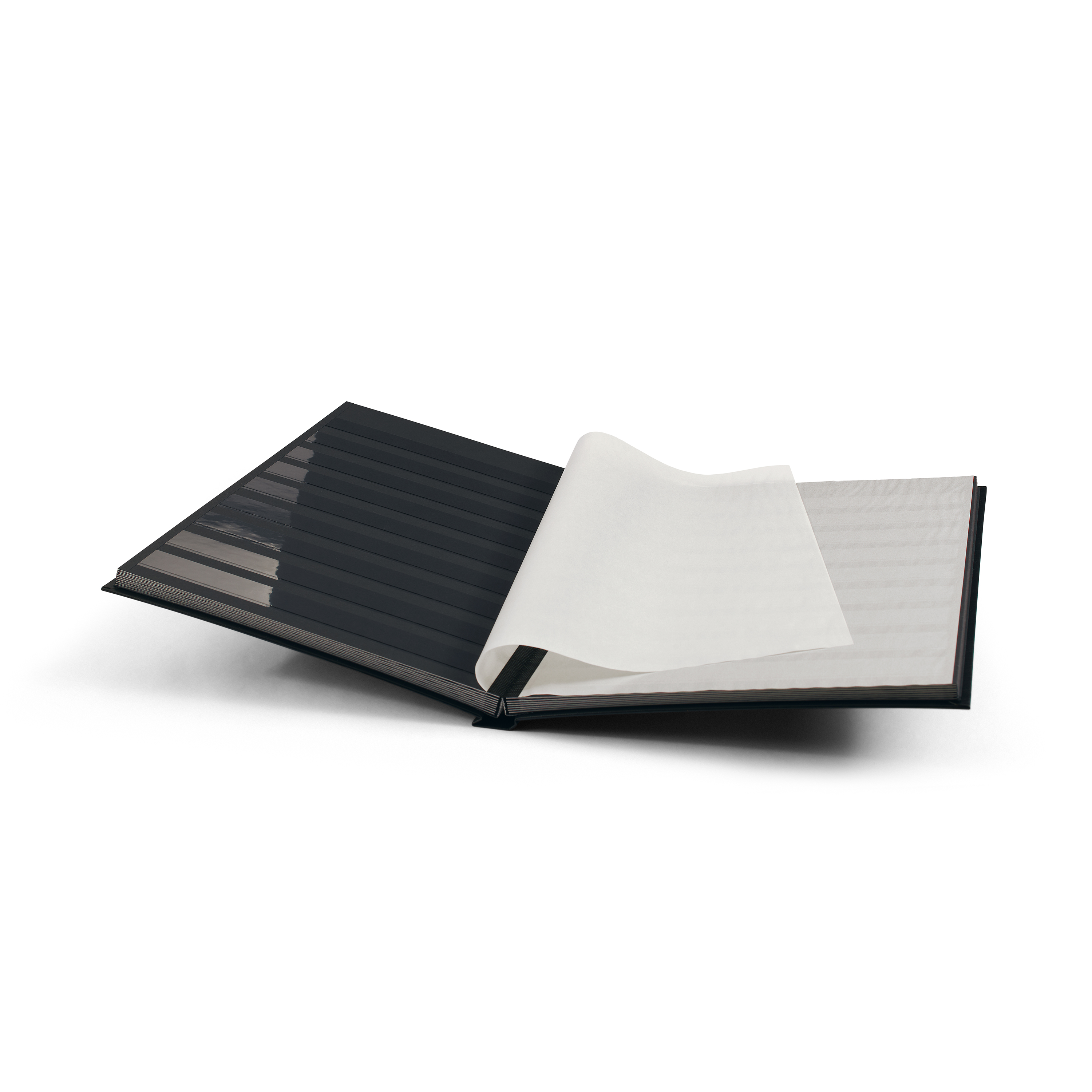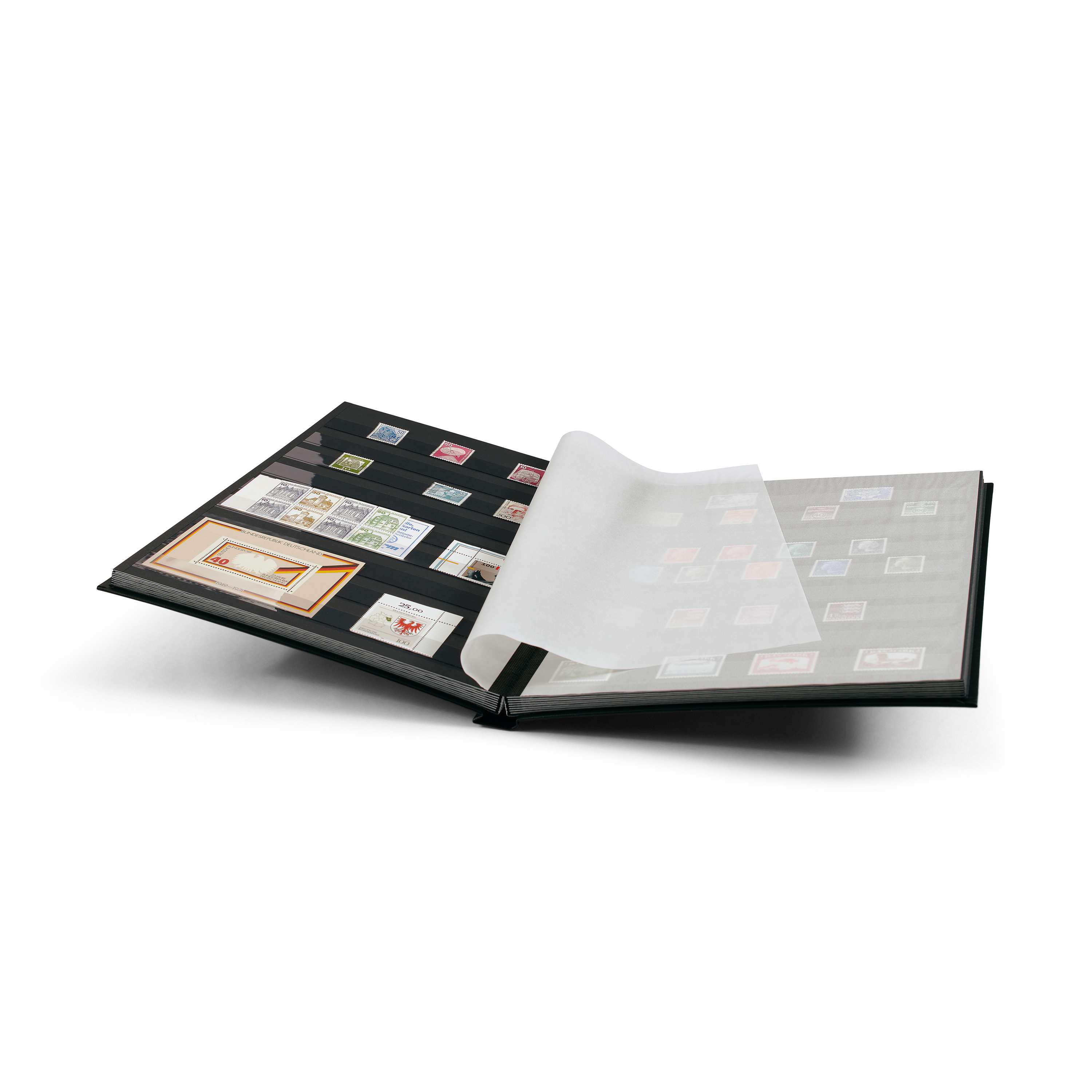 BASIC stockbook A4* with 32 black sheets and un-padded cover. Incl. 9 clear strips per page, interleaves and double hinge binding.