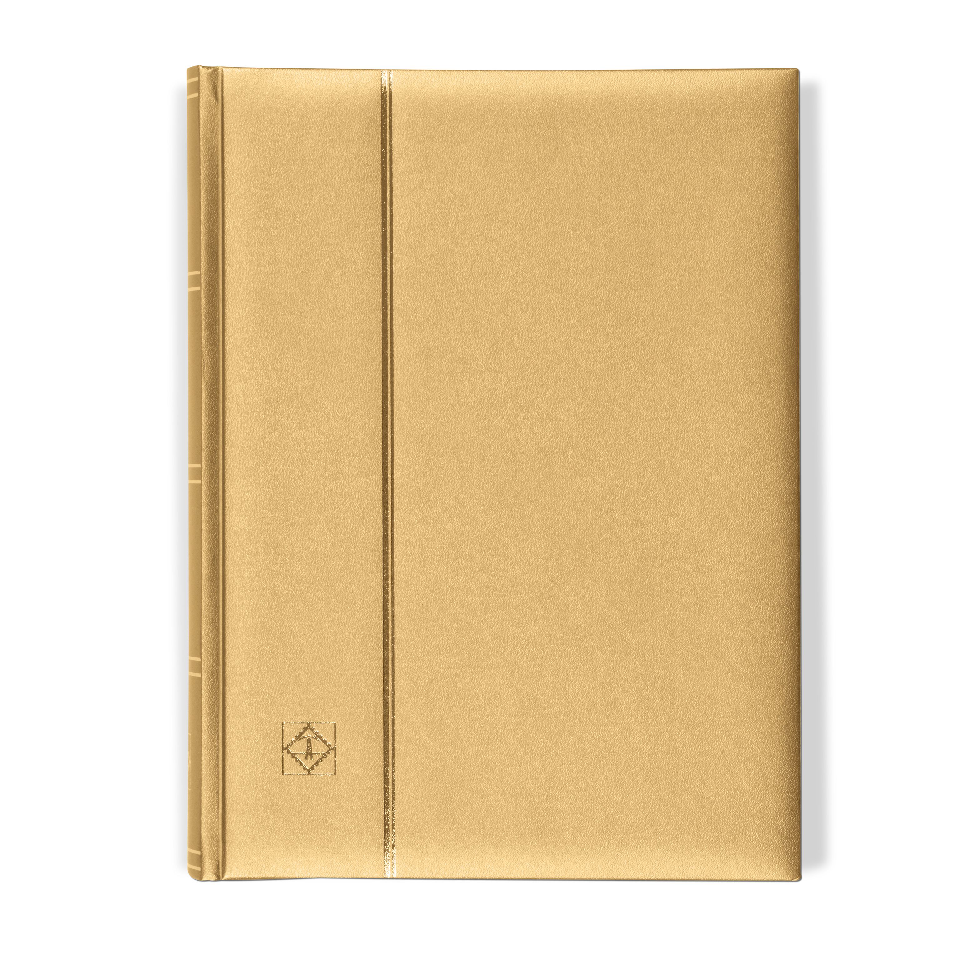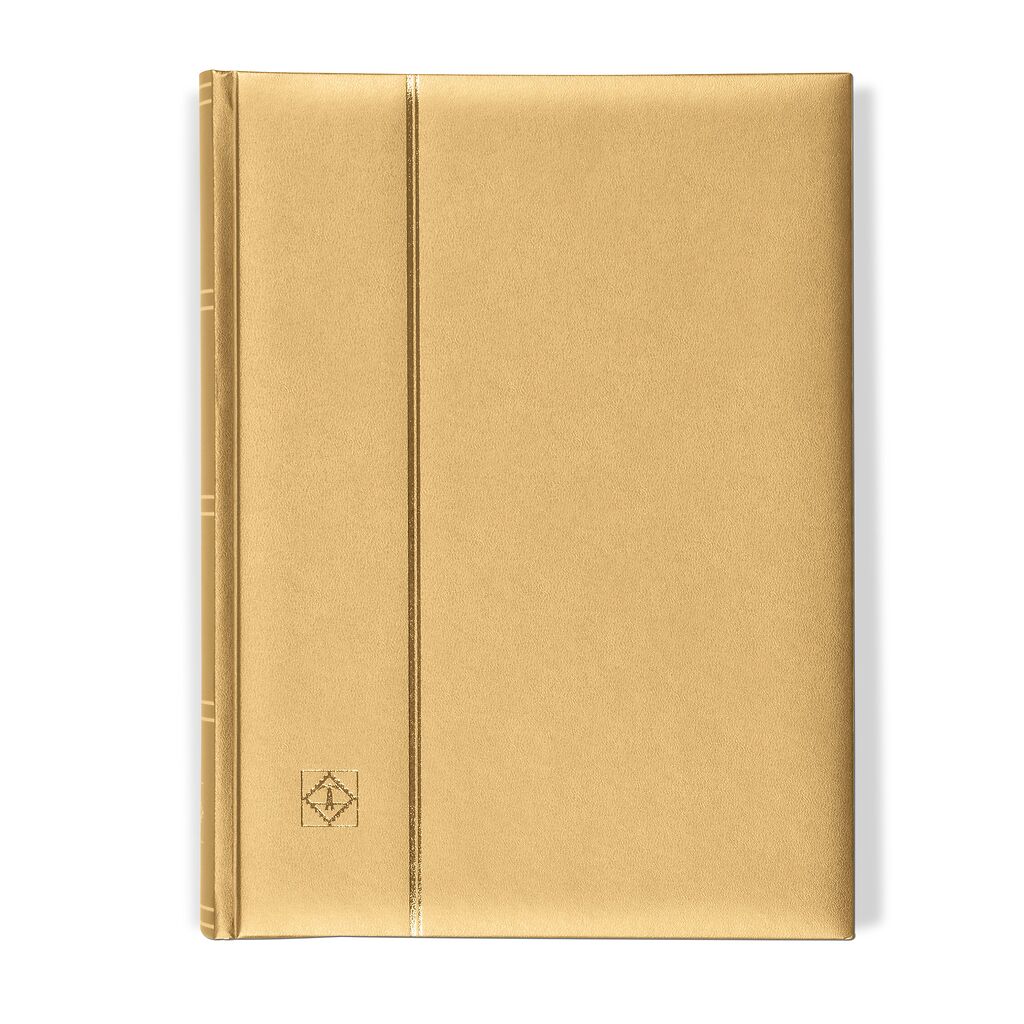 A4 stockbook, 64 chamois-colored pages, padded cover in metallic look, with silver- or gold-colored embossing, 9 glassine strips per page, double glassine interleaves, double linen hinge