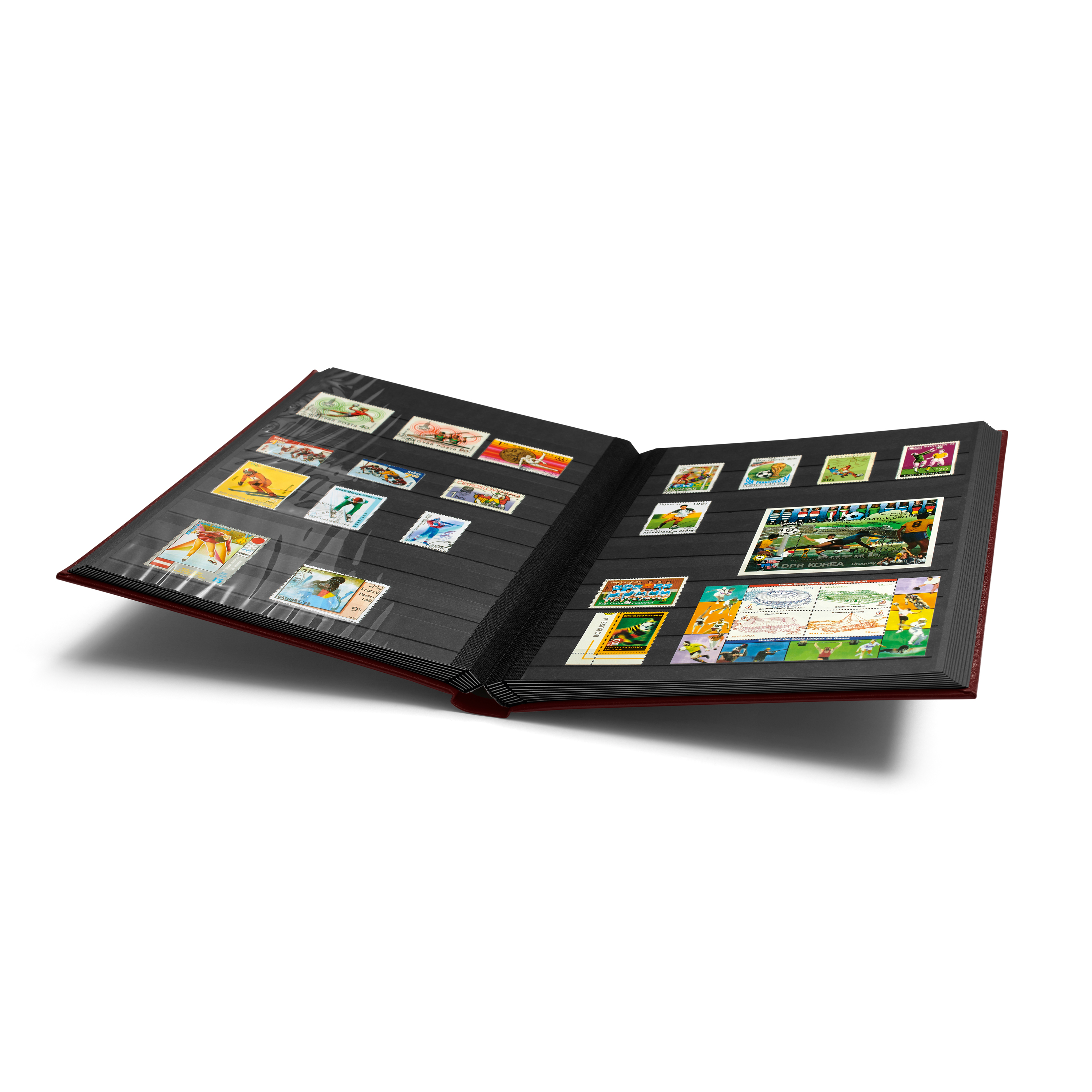 Stockbook with special film free from chemical softeners and double interleaves and double hinge binding. Format A4 with 32 black pages and 9 clear strips per page. Padded cover. Available in 4 colours.