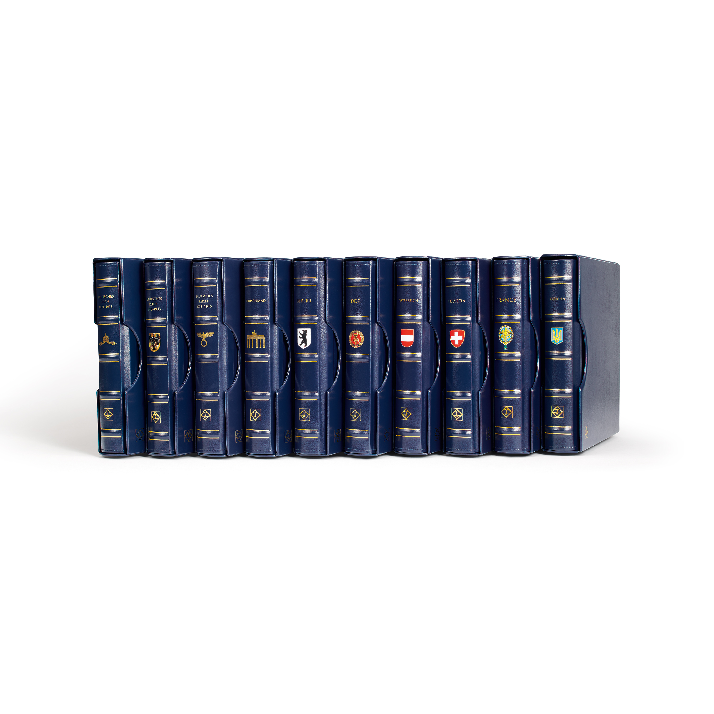 PERFECT binder provides an extra-large capacity and comfortably accommodates up to 120 pages. Including a matching slipcase, this combination offers an amazing price/ performance ratio. Embossed spine (in gold) and national emblem on the back. Cover embossing: incl. emblem + characters at the bottom in gold. Binder size: 290 x 310 mm. Slipcase size: 320 x 325 x 70 mm. Colour: blue.