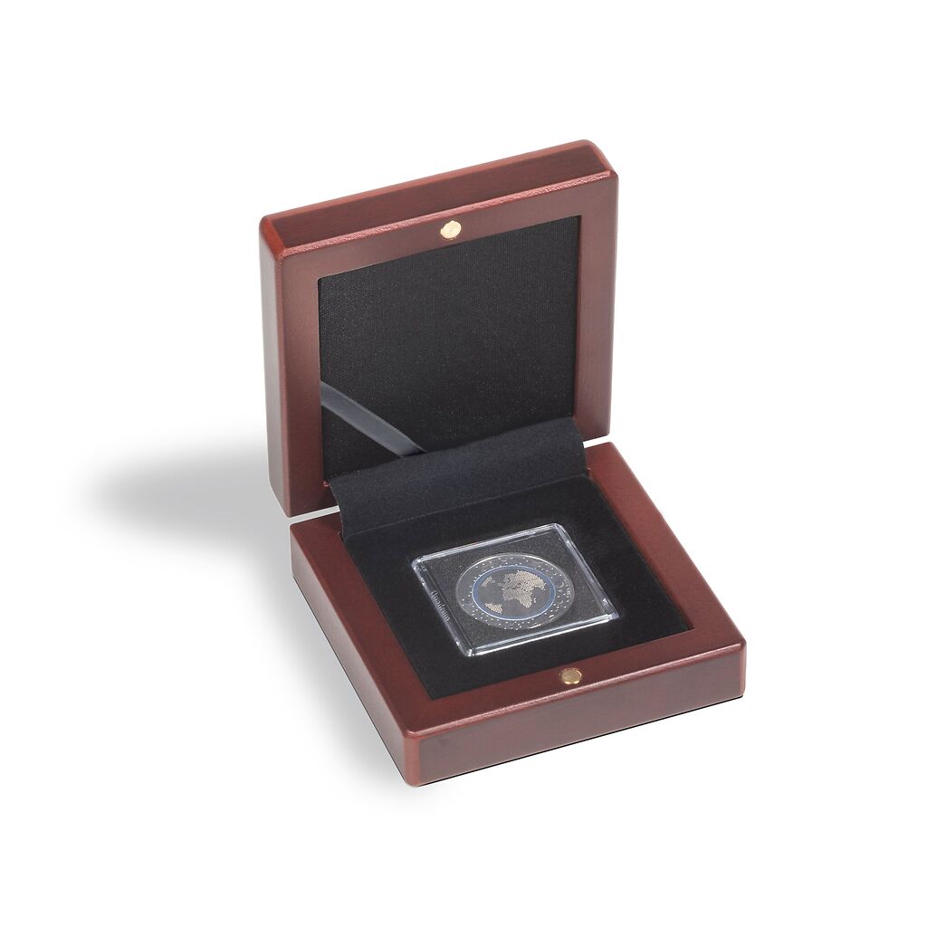 VOLTERRA coin etui with mahogany grain finish for 1 QUADRUM Mini capsule. Lid cushion upholstered in black satin. Black velour-like inlay with one cavity (38 x 38 mm / 1 1/2 x 1 1/2"). Incl. satin band for holding a certificate. Overall size: 80 x 80 mm (3 1/8 x 3 1/8").