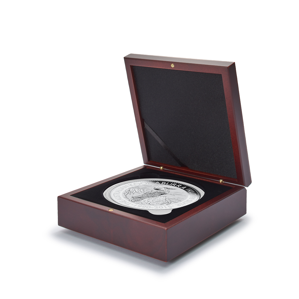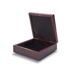 VOLTERRA coin etui with mahogany grain finish for 1 CAPS XL 53–101 capsule. Lid cushion upholstered in black satin. Black velour-like inlay with one cavity (Ø 111.5 mm / 4 3/8"). Incl. satin band for holding certificates. Overall size: 150 x 150 mm (5 7/8 x 5 7/8").