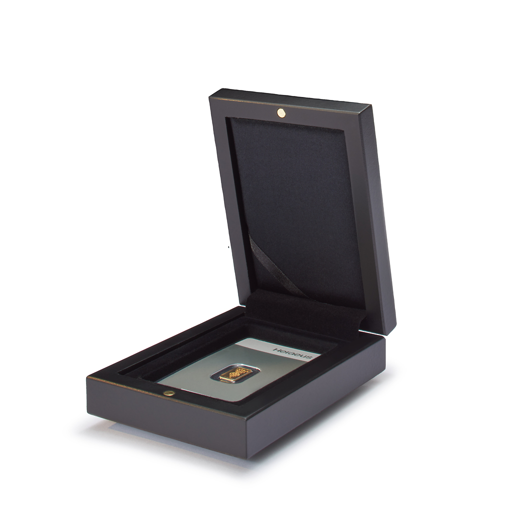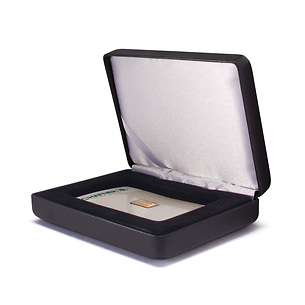 VOLTERRA etui with mahogany grain finish for 1 bullion in blister packaging. Lid cushion upholstered in black satin. Black velour-like inlay with one cavity (86 mm x 54 mm). Incl. satin band for holding a certificate. Overall size: 120 x 90 x 34mm.