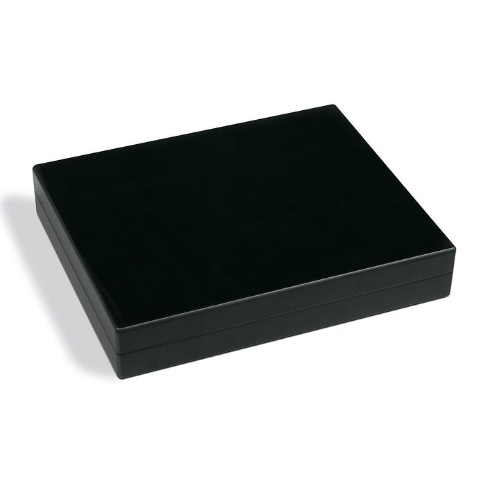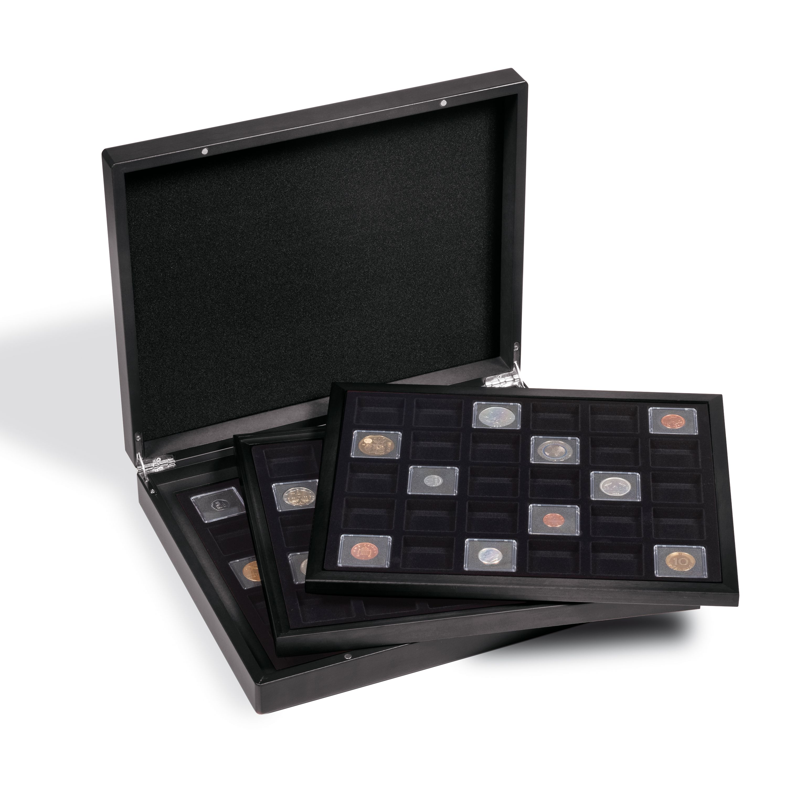 Elegant black presentation case for collecting 90 coins in QUADRUM Mini capsules. 3 trays featuring a black velour surface and 30 square cavities (38 x 38 mm / 1 1/2 x 1 1/2") each. Lid cushion is up-holstered in black satin. Secure and unobtrusive magnetic lock. Overall size: 330 x 55 x 270 mm (13 x 2 1/8 x 10 5/8"). Capsules are not included.