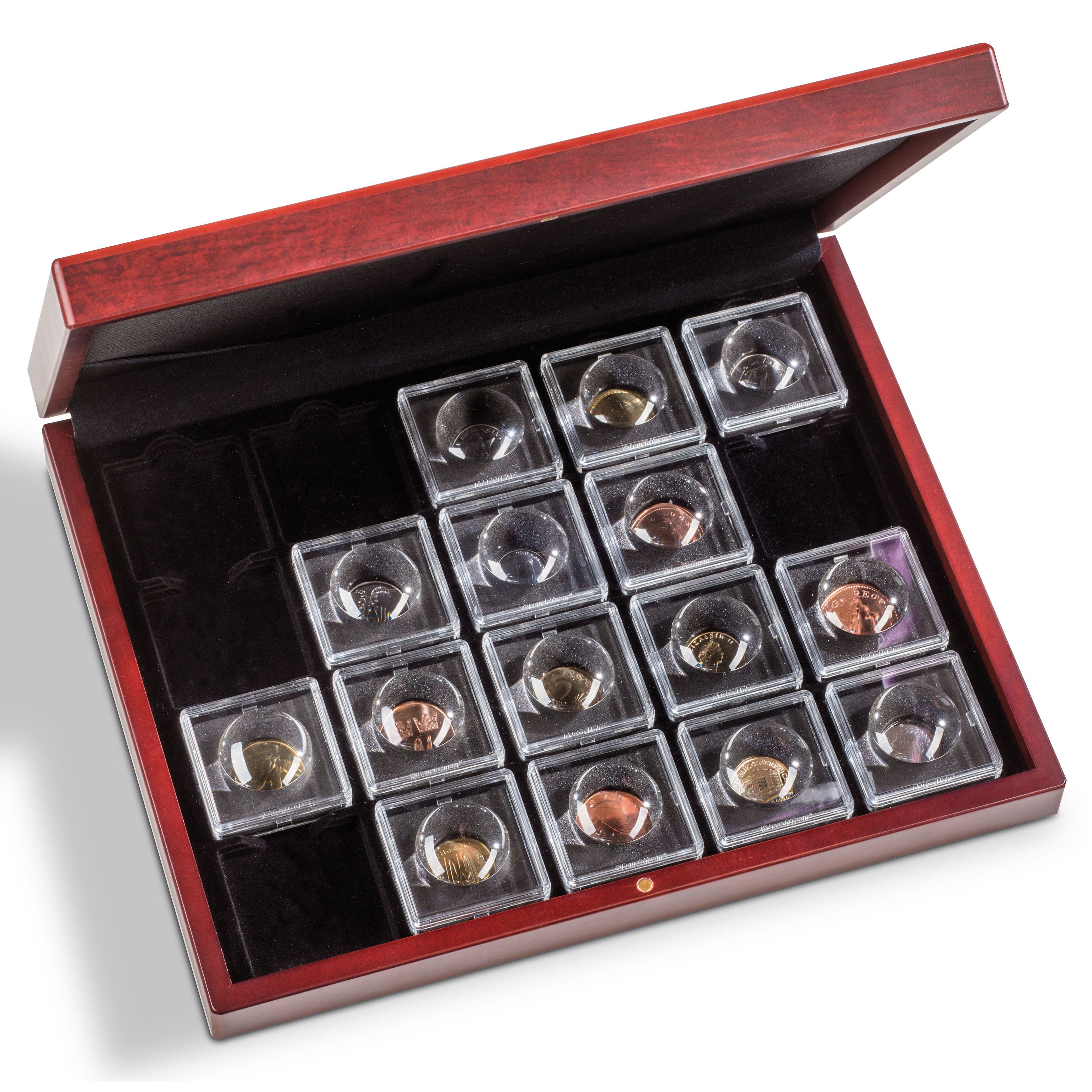 Item number: 346422For 20 MAGNICAPS coin capsules. In mahogany-coloured woodgrain finish. 1 tray featuring a black mock velour surface.